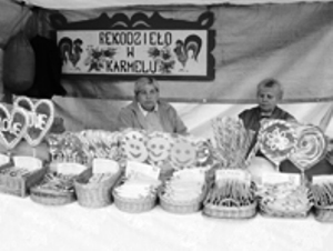 Nie sposób było nie podejść do stoiska z napisem "Rękodzieło w karmelu", na którym rzucały się w oczy duże lizaki w postaci uśmiechniętego słoneczka i dużych serduszek z napisem "Love". Właścicielka stoiska Nina Popławska z Hajnówki chętnie wdała się ze mną w krótką pogawędkę. Jak wytłumaczyła mi, karmel robi się z cukru, syropu i skrobia. Najpierw te składniki gotuje się w miedzianym kociołku w temperaturze do 170 stopni ciepła, następnie dodaje się esencji zapachowej. Później, gdy masa już ostygnie, nożykiem kraja się w odpowiednie formy. Jej babcia Maria Piasecka, mieszkająca do wojny w Brześciu, robiła karmelowe różyczki, którymi chętnie raczyły się córki Marszałka Polski Józefa Piłsudskiego.
