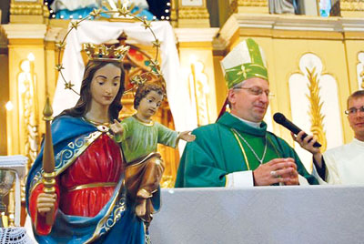 Na zdjęciach: przejście przez Niemen; podczas spotkania z ordynariuszem diecezji wyłkowyskiej pielgrzymi przekazali figurę Matki Bożej Wspomożycielki Wiernych przygranicznej parafii w Lejpunach; od kilku lat pielgrzymi w Koniuchach uczestniczą w apelu, upamiętniającym wymordowaną w 1944 r. wieś.