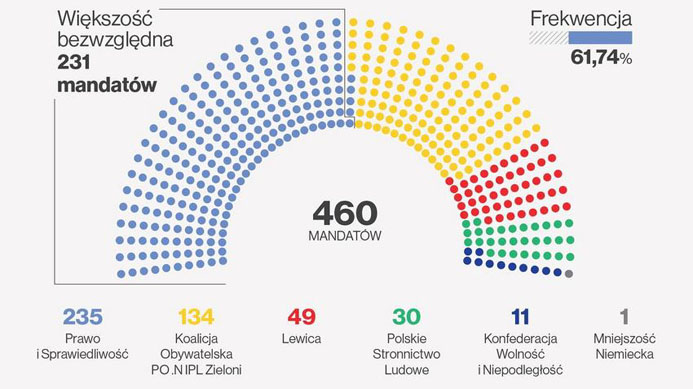 W wyborach do Sejmu PiS zdobyło 235 mandatów; KO – 134; KW SLD – 49; PSL – 30; Konfederacja – 11, a mniejszość niemiecka – 1 mandat – podała Państwowa Komisja Wyborcza. W Senacie PiS obsadzi 48 mandatów, KO – 43, PSL – 3, KW SLD – 2; w senackich ławach zasiądzie też czworo senatorów niezrzeszonych.