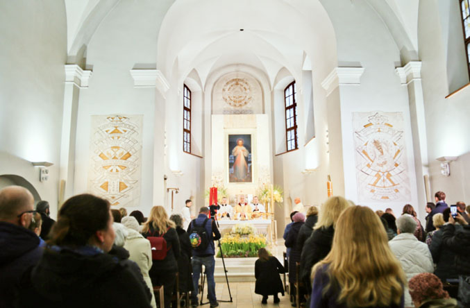 Niedzielną Mszę świętą w języku polskim celebrował JE ks. bp Arūnas Poniškaitis. Biskup w kazaniu mówił m.in., że Ewangelia jest pełna wątków o miłosiernych rękach Jezusa, które „na wsze czasy zostały naznaczone śladami gwoździ – to nie było wygodne i bezbolesne miłosierdzie”. Jak powiedział kapłan, Jezus jest z przybitymi do krzyża rękoma bardziej wolny niż jakikolwiek człowiek przywiązany do dóbr doczesnych i przepychu. „Przybitymi rękoma Jezus bardziej niż ktokolwiek obejmuje każdego poniżonego” – identyfikuje się w pełni z cierpiącym. Biskup wspomniał także, że oprócz rąk Chrystus miał także przebite serce, „które otwiera tajemnicę Bożego Miłosierdzia”. „Z serca Jezusa wypływa życie, które jest darowane dla nas. Z serca Jezusa wytryska miłość, bez której nie miałyby znaczenia i przebite ręce. Nie mając miłości stajesz się nikim”.